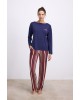 Lacivert uzun kollu T-shirt sade ve modern çizgileriyle şık bir görünüm sunarken, çizgili rahat kesim pantolon ise esnek bel yapısıyla konforlu bir uyum sağlar. Hem gece uykusunda hem de evde dinlenirken maksimum rahatlık isteyenler için ideal bir kombinasyon.