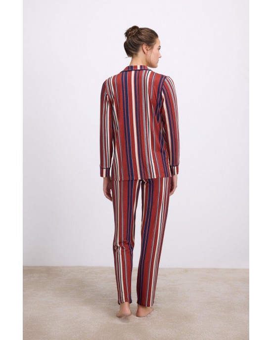 Uzun kollu düğmeli üst, çizgili modern tasarımıyla klasik pijama şıklığını yeniden yorumlarken; aynı desenli rahat kesim pantolon ise esnek bel yapısıyla gün boyu konfor sunar. Hafif, akışkan ve kaliteli dokusu ile hem estetik hem de yüksek konforlu bir kullanım vadeder.