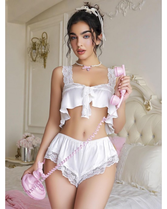???? Beyaz Dantel İşlemeli Sütyenli Saten Şortlu Takım ????