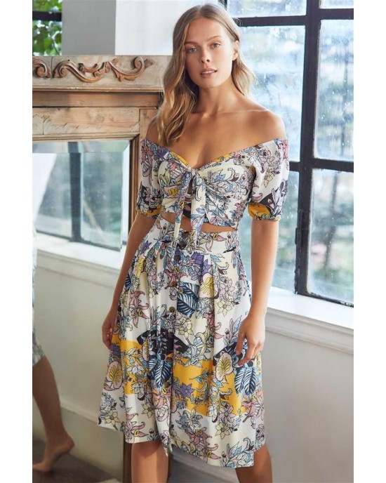 Arias Closet Dokuma Önden Bağlamalı Çiçek Baskılı Omuzu Düşük Büstiyer ve Önden Düğmeli Etek Takım (9658)