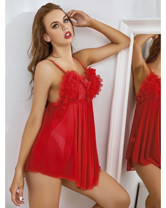 Aşkın ve tutkunun rengi kırmızıyla tasarlanan bu fantezi babydoll, hafif tül dokusuyla zarif bir feminenlik sunuyor. Vücudu nazikçe saran kesimi ve akıcı tül yapısı, romantik ve şehvetli bir görünüm kazandırıyor.