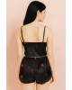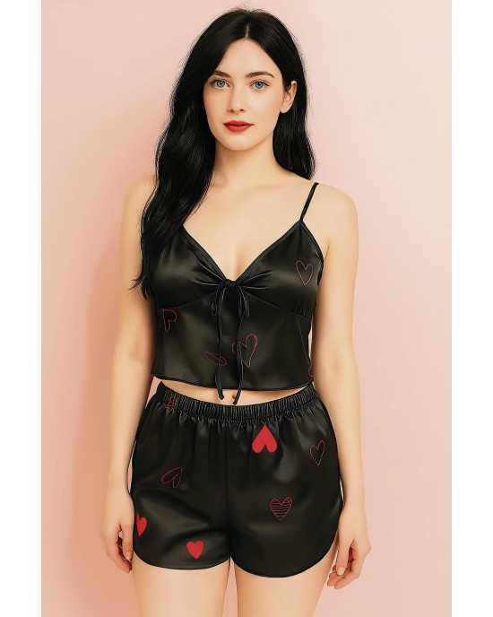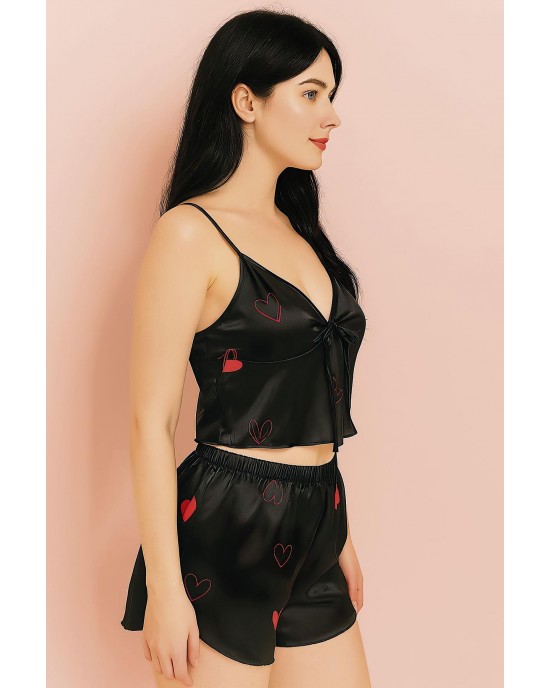 Arias Closet Siyah İnce Askılı Kalp Desenli Saten Şortlu Takım