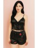 ???? Siyah İnce Askılı Kalp Desenli Saten Şortlu Takım ????