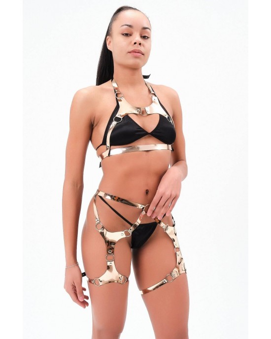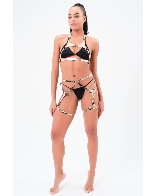 Deri Jartiyerli Gold Renk Harness Deri Takım