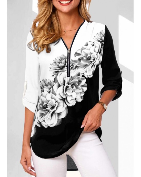 Kadın Uzun Kollu V Yaka Fermuarlı Dijital Baskı çiçek Desen Salaş Dalgıç Bluz